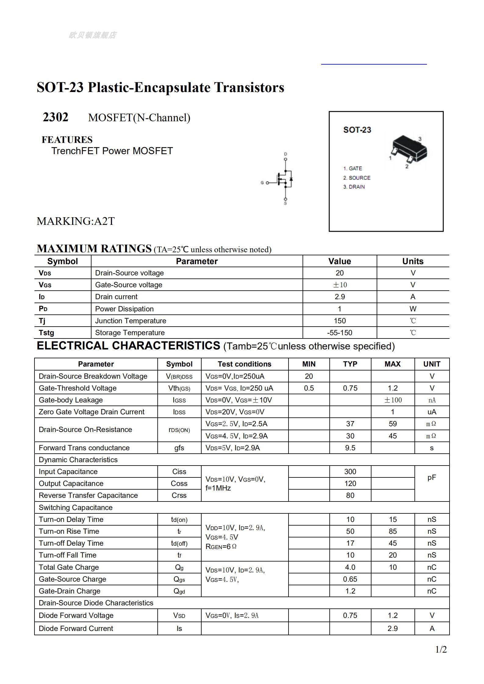 • SI2301 A1SHB SI2302 A2SHB A2T 2A 3A SOT-23-3L SMD MOS FET